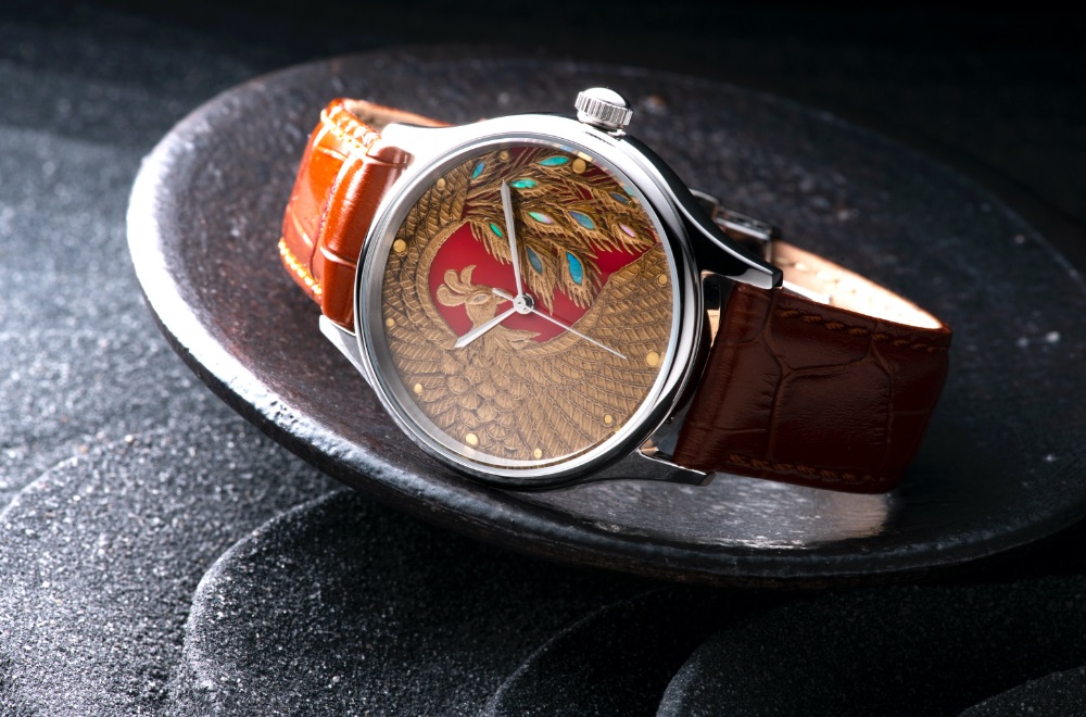 文字盤全面に金で盛り上げた鳳凰を描き、羽根の部分に一本一本描いた上絵の細い線が蒔絵ならではの技法の一つであると思います。